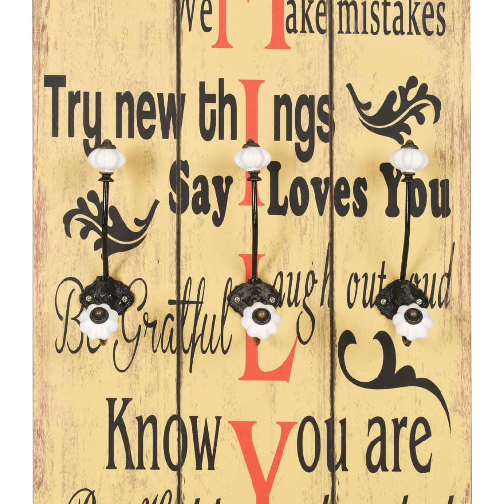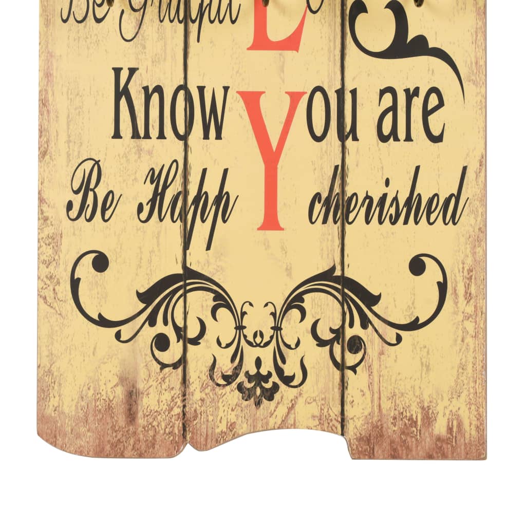 Met de in vintage stijl gedrukte tekst: "Be thankful Always forgive Share Respect one another Show compassion We make mistakes Try new things Say I love you Be grateful Laugh out loud Know you are cherished Be happy"; wordt deze kapstok voor aan de muur met 6 haken een echte blikvanger die je gasten onmiddellijk zullen opmerken.