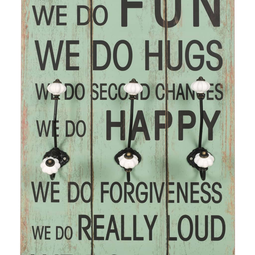 Met de in vintage stijl gedrukte tekst: "In this house…we do real we do mistakes we do fun we do hugs we do second chances we do happy we do forgiveness we do really loud we do family we do love"; wordt deze kapstok voor aan de muur met 6 haken een echte blikvanger die je gasten onmiddellijk zullen opmerken.